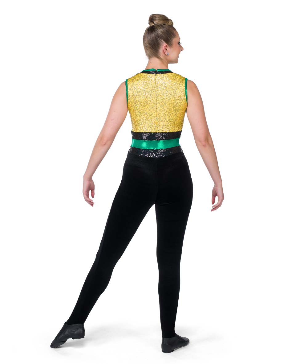 Lined sequin spandex, foil lycra and velvet sleeveless unitard with elite sequin insets. Made in the USA.